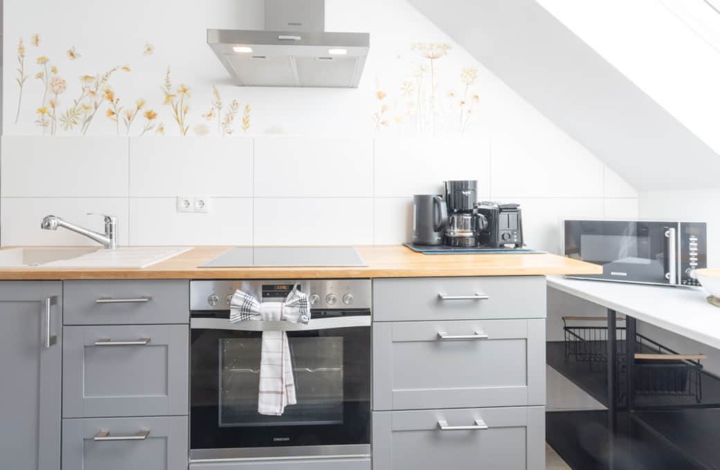 Coffee machine, Cooking utensils, Kitchen stove, Kitchenette, Oven, Refrigerator